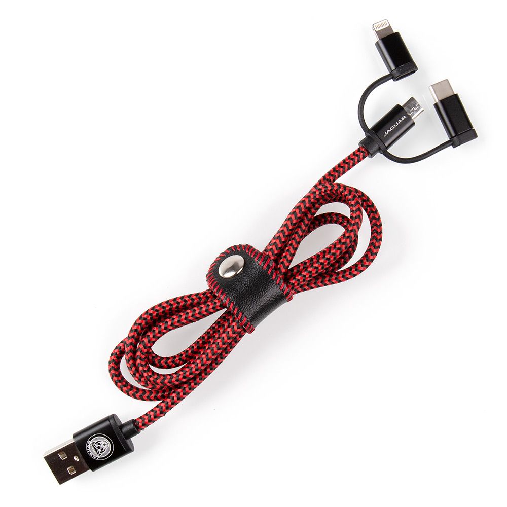 Woven USB cable for iPhone with nylon braided jacket in Red/Black. Includes 3-in-1 cable with micro, lightning and type-C connectors.